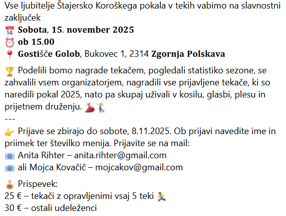 PridruΕΎite se nam in skupaj zakljuΔimo tekaΕ‘ko sezono 2025 v prijetnem vzduΕ‘ju!