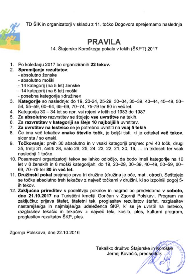 V letošnjem pokalu je na sporedu 22 tekov. Za opravljen pokal se je potrebno udeležiti vsaj 5 tekov, za absolutno razvrstitev štejejo vsi teki, za razvrstitev v starostni kategoriji se upoštava 10 najboljših uvrstitev tekača.